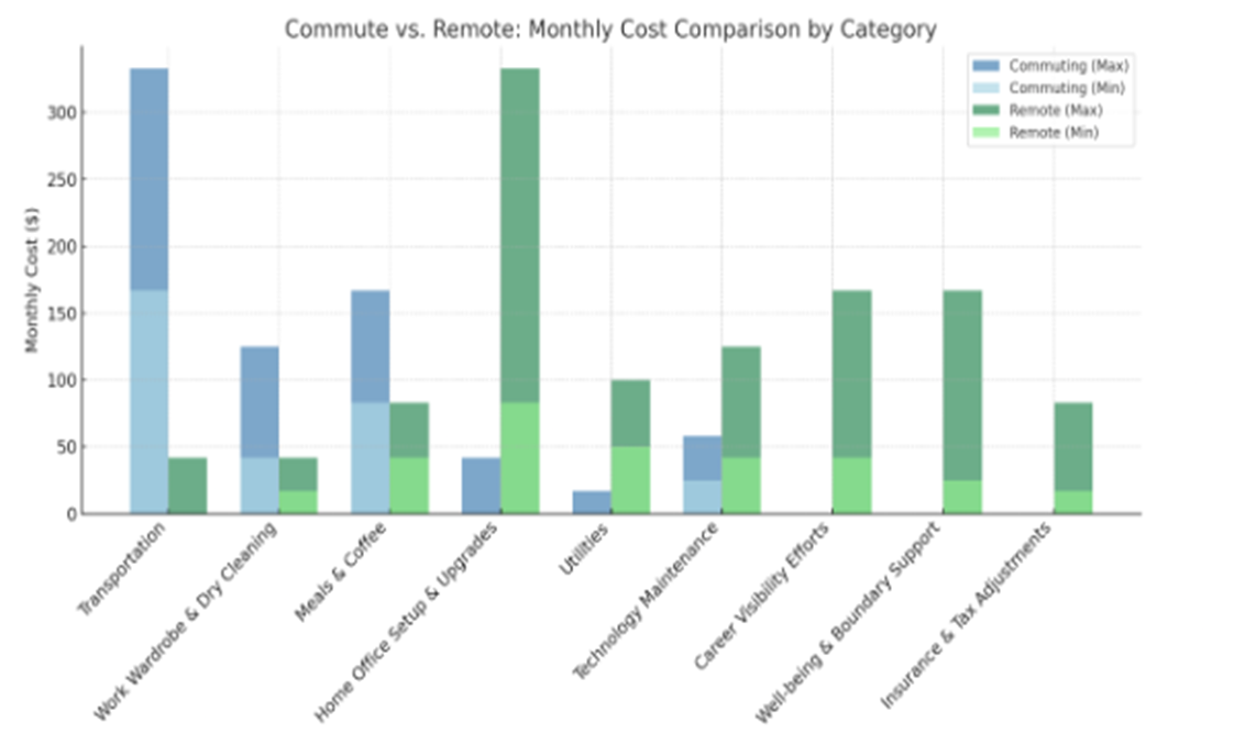 The bottom line: while remote work may save money on transportation and wardrobe, added costs in utilities, technology, and professional visibility can narrow the gap more than expected.